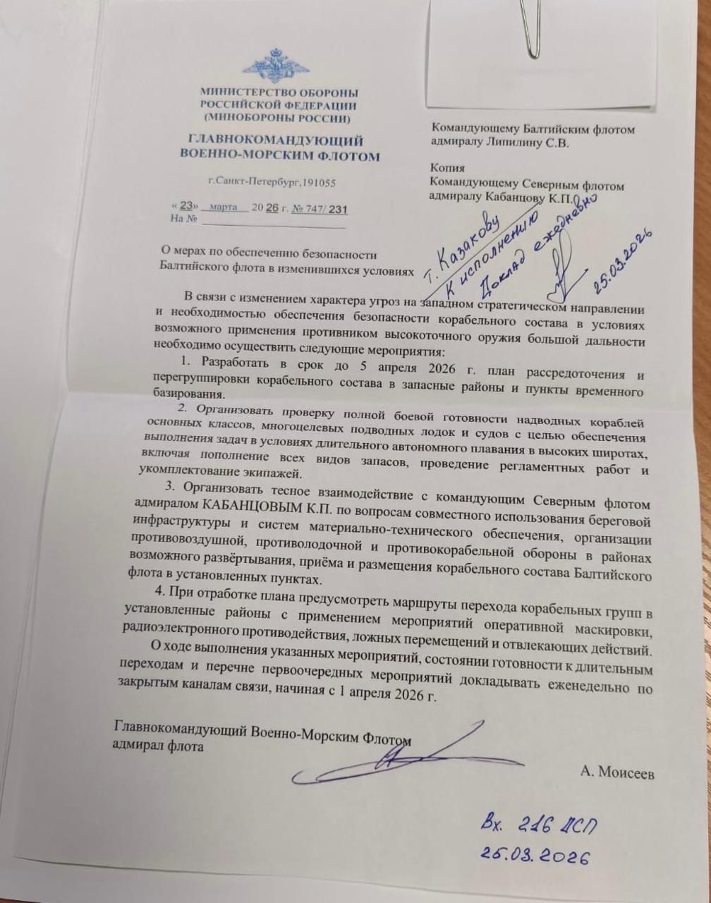 В сети также активно упоминается наличие соответствующих распоряжений, якобы подписанных лично Главнокомандующим ВМФ адмиралом флота Александром Моисеевым, однако официального подтверждения их подлинности на данный момент нет.