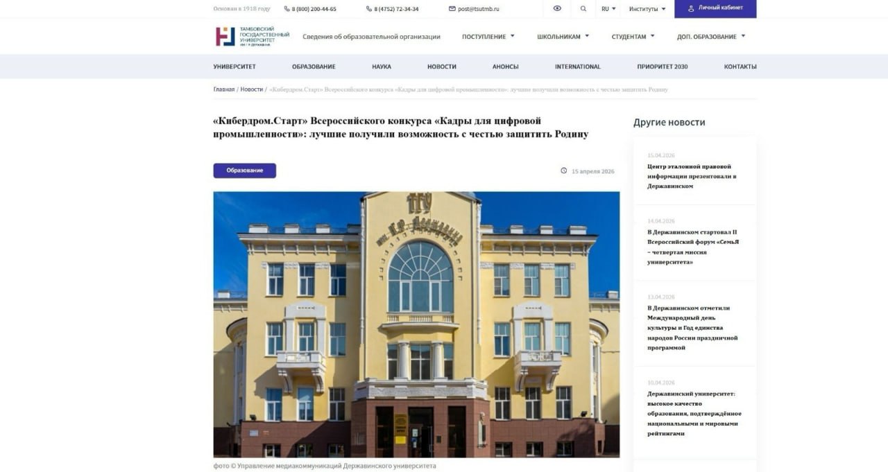 15 мая 2026 года в Тамбовском государственном университете имени Г.Р. Державина успешно прошёл отдельный трек Всероссийского конкурса «Кибердром.Старт».
