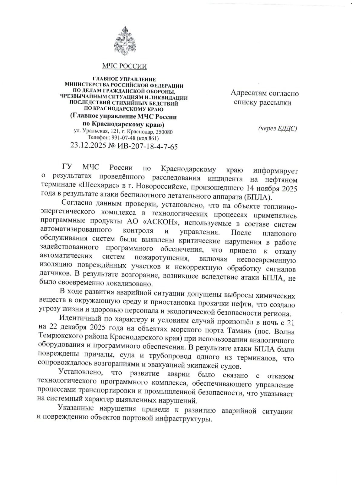 На этом фоне ГУ МЧС России по Краснодарскому краю направило в адрес операторов объектов ТЭК, портовой и морской инфраструктуры официальное письмо. В документе ведомство информирует о результатах расследования инцидентов в Новороссийске и Темрюкском районе и указывает на выявленные системные нарушения в работе автоматизированных систем управления и противопожарной защиты