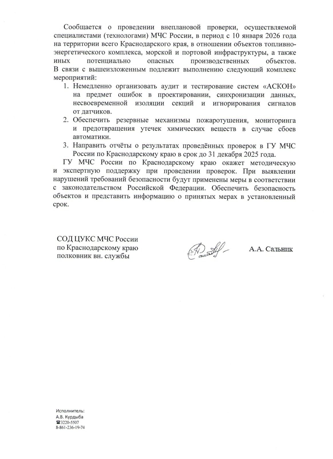 Отдельным разделом документа ГУ МЧС уведомляет о проведении внеплановых проверок, которые начнутся с января 2026 года и охватят весь Краснодарский край. В рамках этих мероприятий организациям предписано в сжатые сроки провести аудит и тестирование систем автоматизации и пожаротушения, обеспечить наличие резервных механизмов реагирования, а также направить отчёты о принятых мерах в адрес регионального управления МЧС.