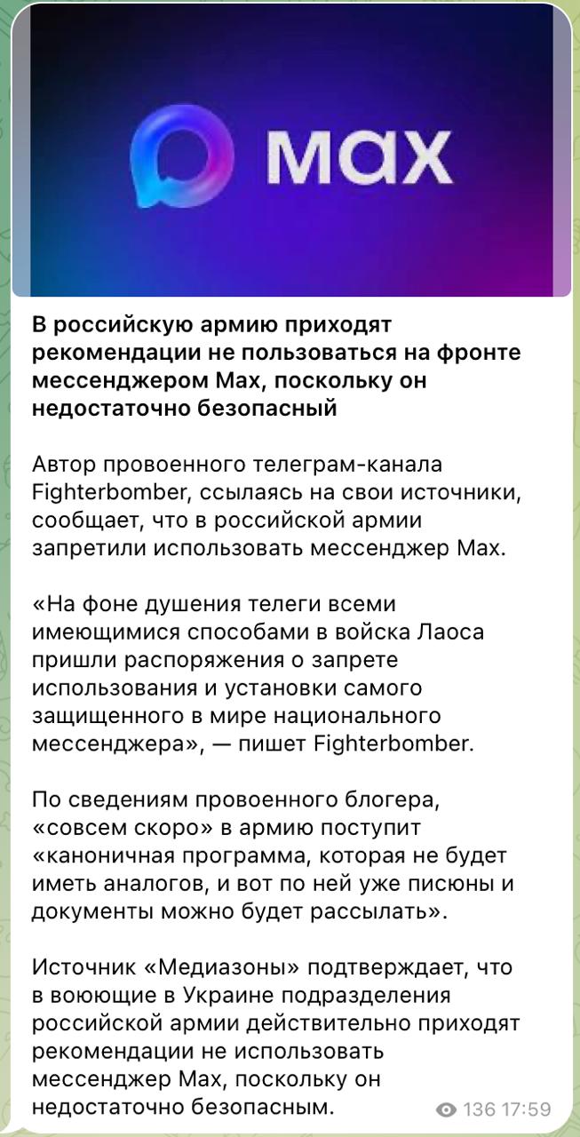 Автор провоенного телеграм-канала Fighterbomber, ссылаясь на свои источники, сообщает, что в российской армии запретили использовать мессенджер Max.