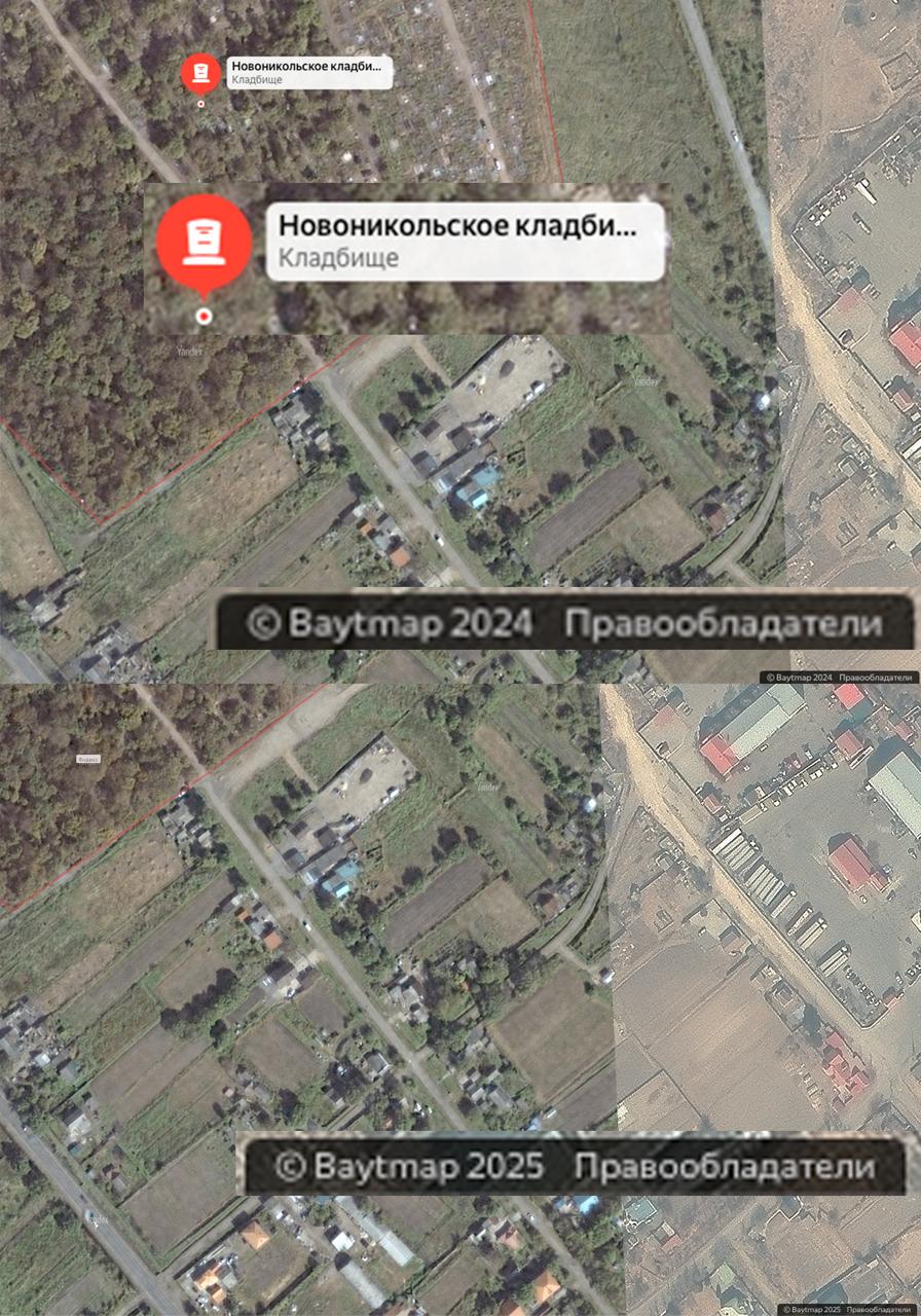 На примере Новоникольского кладбища под Уссурийском видно, что соседняя местность уже обновлена на карте, тогда как сам участок кладбища сфотографирован годом ранее. При этом в Google участок давно уже обновлен.