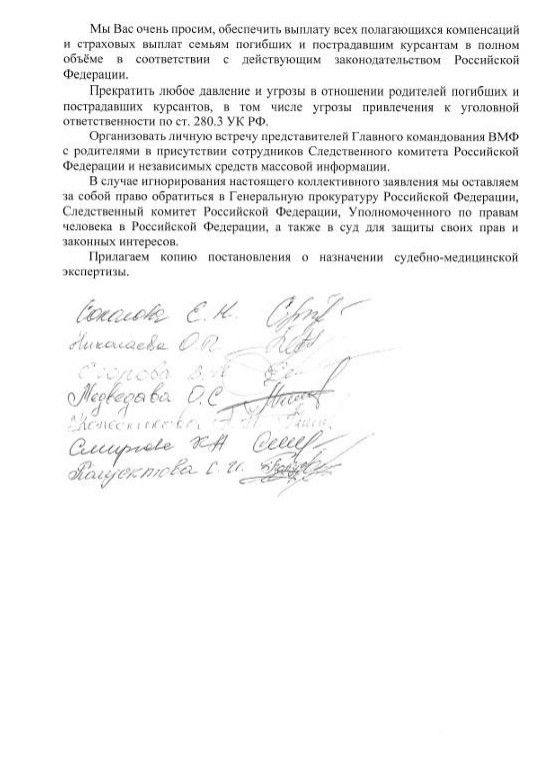 Они обращаются к Главнокомандующему ВМФ РФ с требованием справедливости, выплат компенсаций и прекращения давления на семьи.