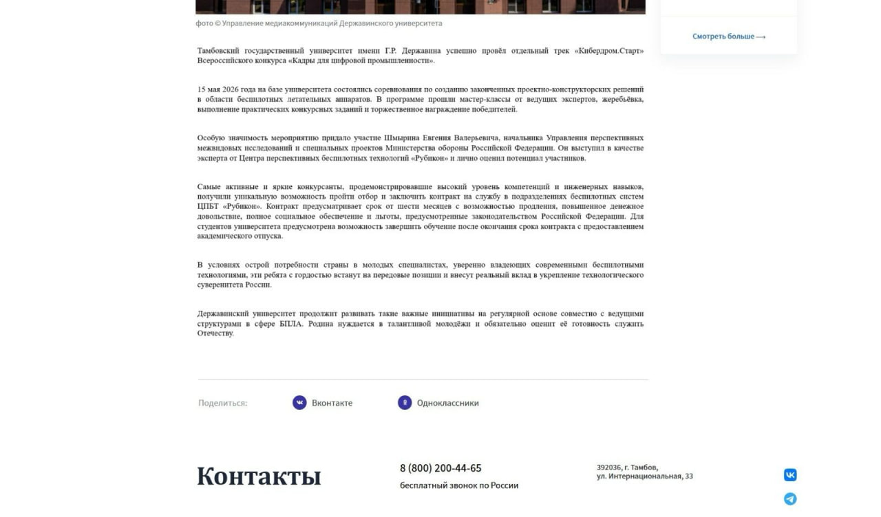 15 мая 2026 года в Тамбовском государственном университете имени Г.Р. Державина успешно прошёл отдельный трек Всероссийского конкурса «Кибердром.Старт».